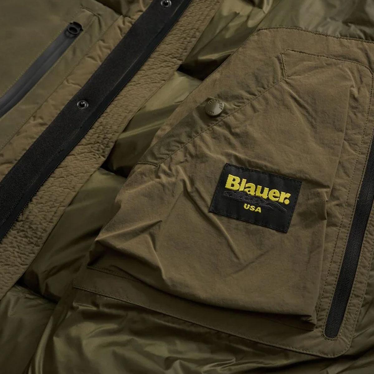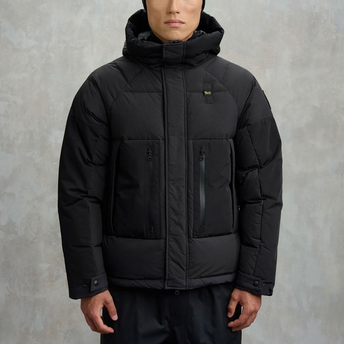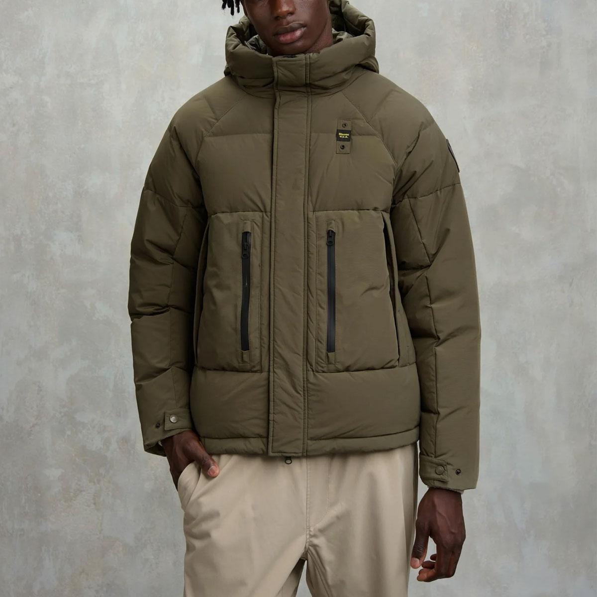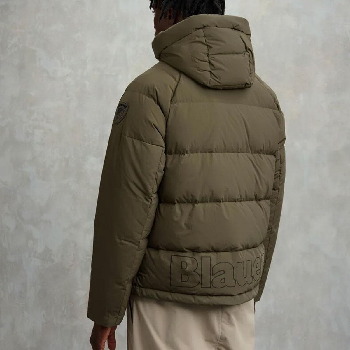 Piumino con maniche raglan in nylon dal tocco cotone con inserti in taslan su cappuccio, tasche e retro. Scritta Blauer stampata sul fondo dietro per dare un tocco deciso ed audace allo streetwear