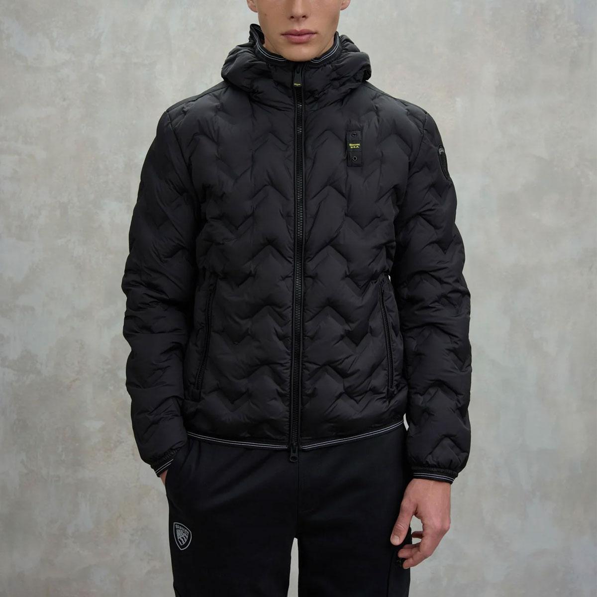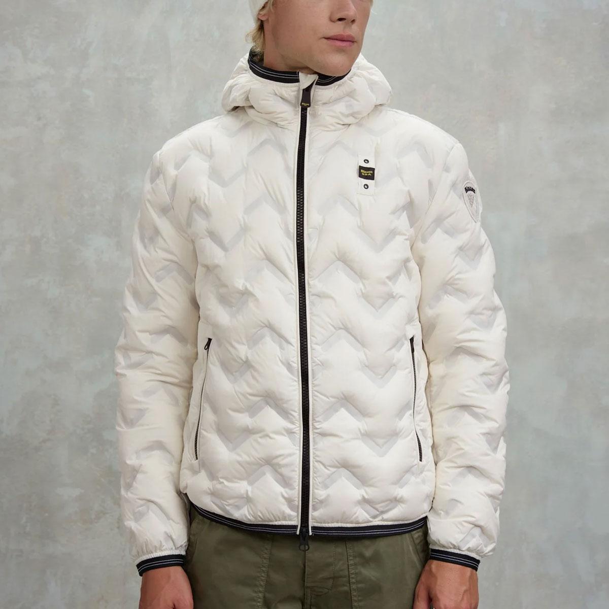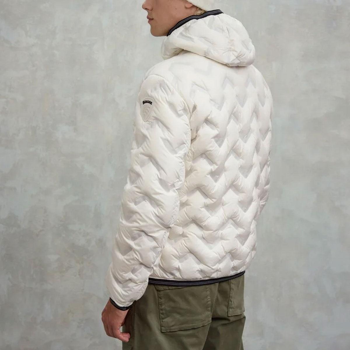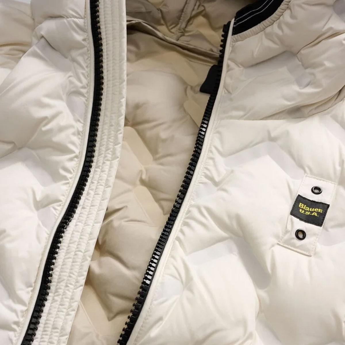 Piumino con cappuccio fisso e profilo dall’aspetto aderente e increspato. Cuciture nastrate ad angoli che dona un tocco innovativo e dinamico.