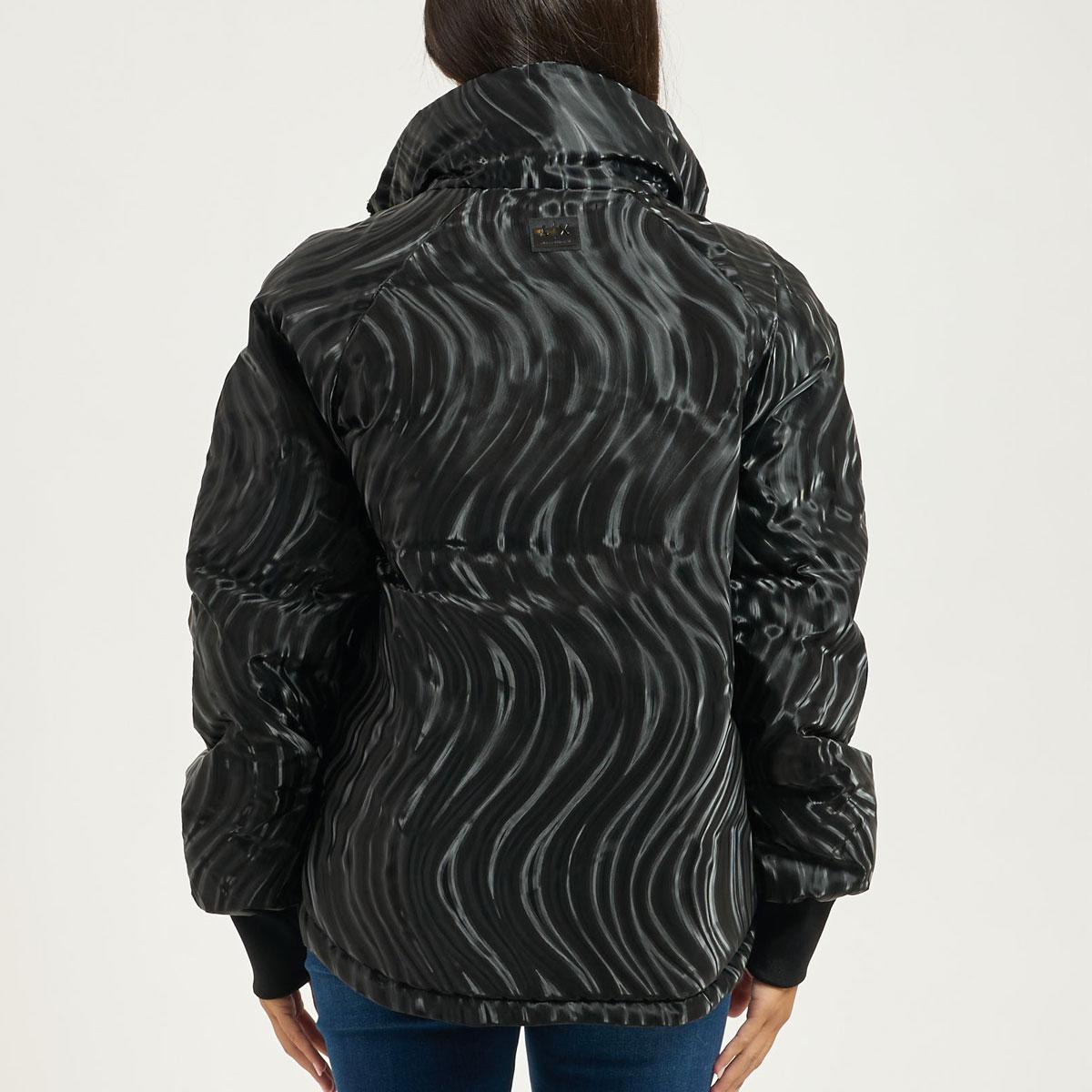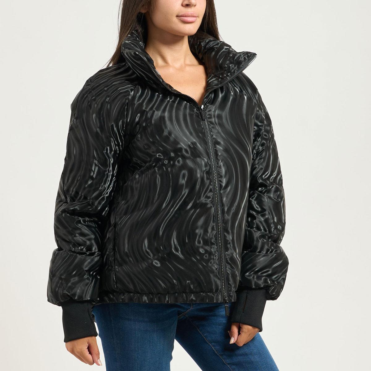 Giubbotto donna Armani Exchange modello a collo alto con effetto spalmato all-over, fullzip e polsi con elastico. La modella indossa la taglia S ed è alta 170cm