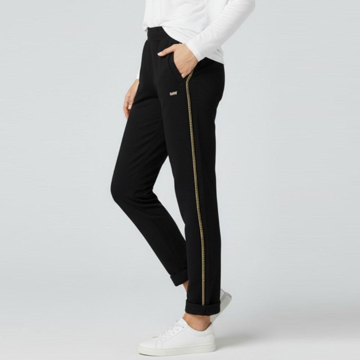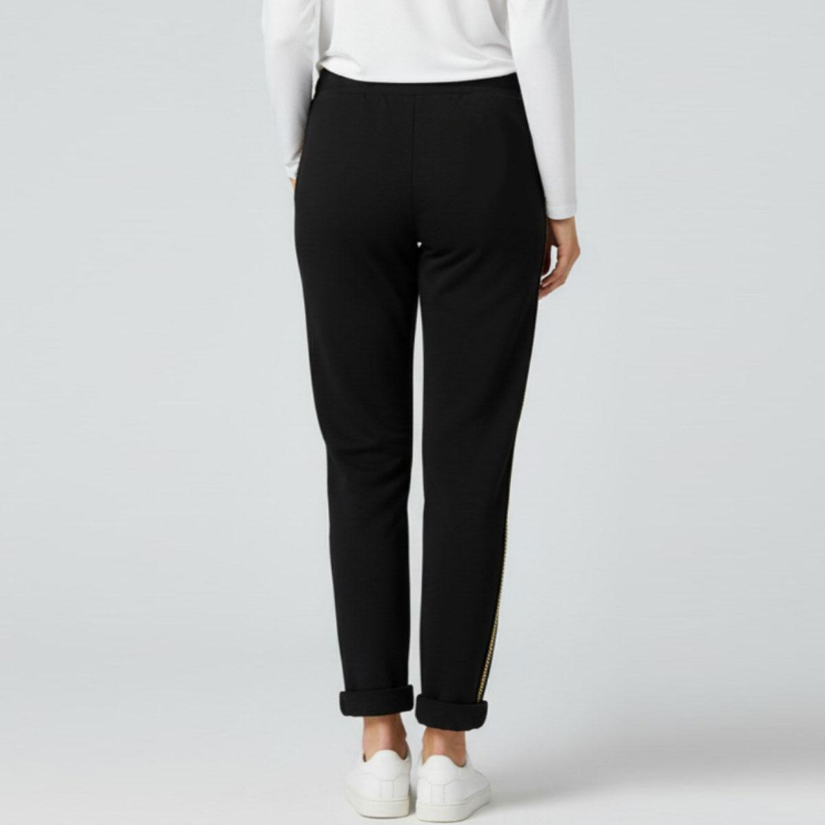 Markup pantaloni in felpa da donna in misto cotone, con distintivi dettagli a catenina dorata lungo le cuciture laterali che aggiungono un tocco di luce e raffinatezza, trasformando un semplice pantalone in un capo di tendenza. Le pratiche tasche oblique laterali e gli orli risvoltati completano il design, unendo funzionalità e stile.
